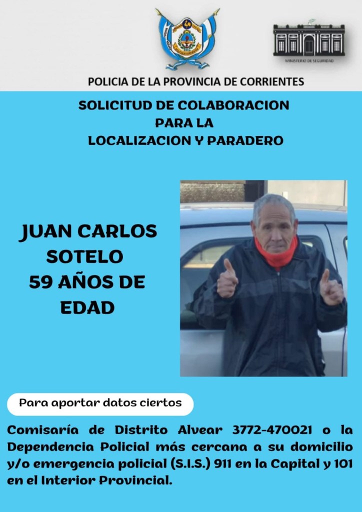 Alvear, 10 de julio de 2025 — La Policía de Corrientes, a través de la Comisaría de Distrito Alvear y distintas áreas de apoyo, continúa con una intensa búsqueda para dar con el paradero de Juan Carlos Sotelo, de 59 años de edad, quien se encuentra desaparecido desde el pasado domingo, cuando salió de su casa con la intención de asistir a un partido de fútbol de primera división. Desde ese momento, no se volvió a tener noticias sobre su ubicación.